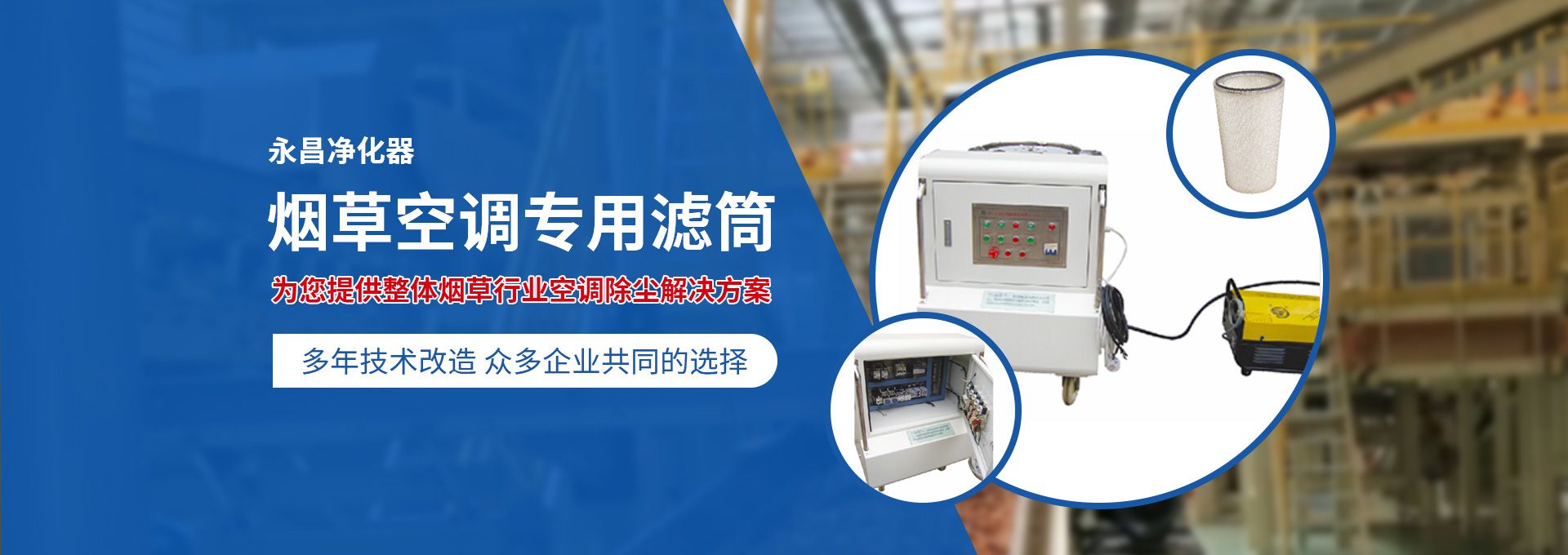 新鄉市永昌凈化器有限公司是生產煙草行業空調除塵專用濾筒的企業。注冊資金1000萬元。已通過ISO9001國際質量管理體系認證。對產品有嚴格的管理制度和售后服務。我公司以誠信、負責、守信譽、重質量的精神所生產的產品,近幾年來在煙草行業受到廣泛應用,并受到用戶的一致好評?! 囊痪啪潘哪暌詠頌闊煆S的空調設備服務。十幾年來,我們不斷走出去請進來學習新技術。定期到用戶那里咨詢情況:互相交流,認真聽取寶貴意見,不斷提高產品質量。從經濟和安全,方便的角度出發,根據煙廠濕度大的生產環境和濾筒收集到的含酸堿、氧化劑的粉塵。在空調箱工作狀態下我們頂著巨大的風壓危險在箱內停留了幾分鐘,認真查看濾筒工作情況,發現濾筒有并死狀態,造成濾筒不過濾、不過風、壓差高的現象。經幾十次試驗分析,在標本兼治的原則下,有針對性的解決了這一問題。  我公司針對煙廠制絲、卷接包、混絲間、儲絲房、冷卻床、梗膨化等不同的生產環境,